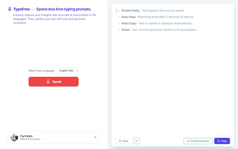 Användare kan enkelt välja språk innan de börjar tala, och TypeFree slutar automatiskt spela in efter 3 sekunders tystnad. Texten kopieras automatiskt till urklipp när inspelningen avslutas, vilket eliminerar behovet av att manuellt klicka för att kopiera. Med möjligheten att snabbt förbättra grammatik och interpunktion med ett enda klick, är TypeFree ett utmärkt verktyg för att skriva tydligare AI-promptar eller skicka meddelanden på ett främmande språk.
